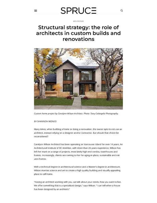 “Structural Strategy, the role of Architects in Custom Home Builds’ Spruce Magazine, written by Shannon Moneo, April 2022. Featuring interview with Carolynn Wilson and her client